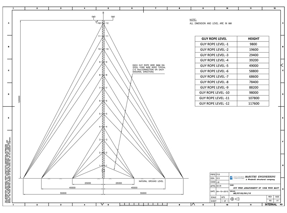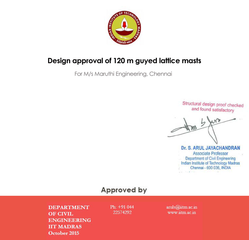 M/s Maruthi Engineering Chennai approached IIT Madras for the design approval of 120m guyed masts.The Designs were supplied by M/s Maruthi Engineering Chennai.IITM Carried out an independent design checking using IS:875 P3 for wind loads (K1 =k3=1.0 and Vb=50m/sec) and IS :800 (2007) for design of mast shaft components. ANSI/TIA-222-G-2005,EC3 Part 7-1 and AS-3995 were used to check the design of other components.Based on an independent study by IITM it is certified that the designs submitted by M/s Maruthi Engineering for 120m guyed lattice masts are structurally adequate and satisfactory.
